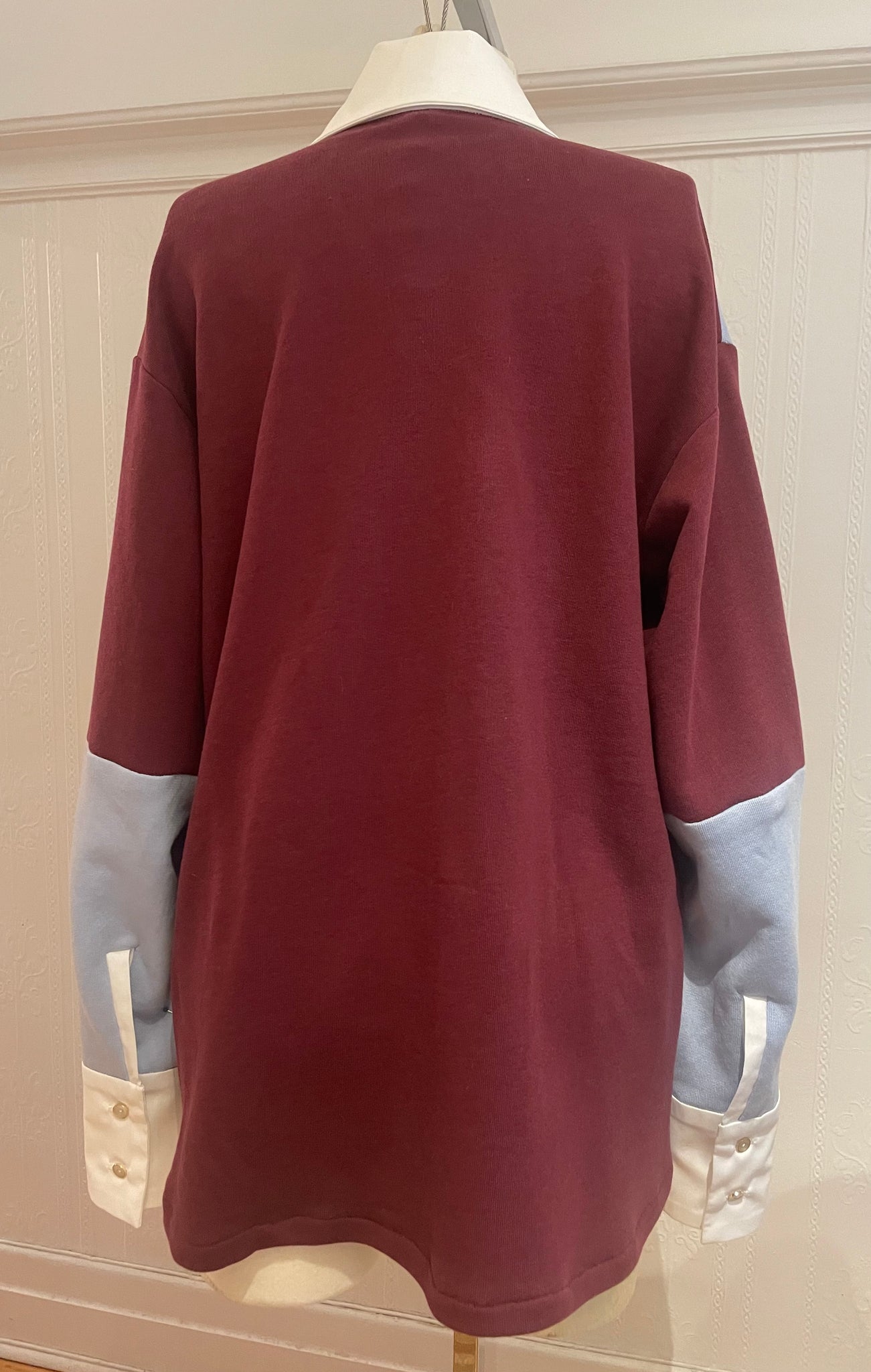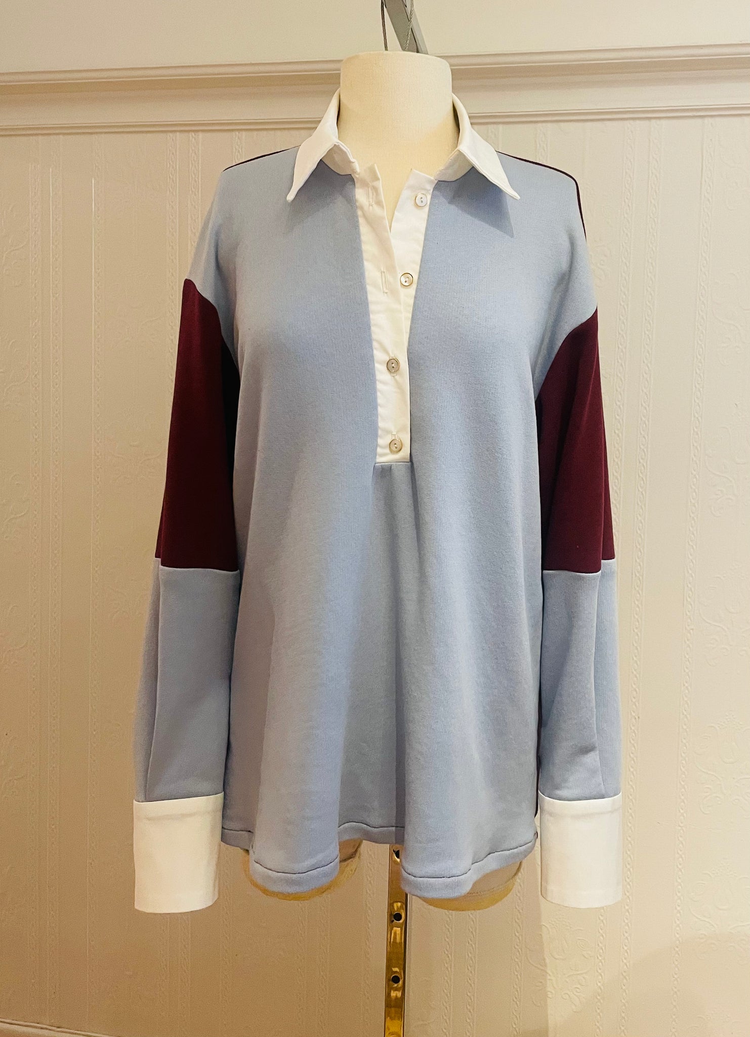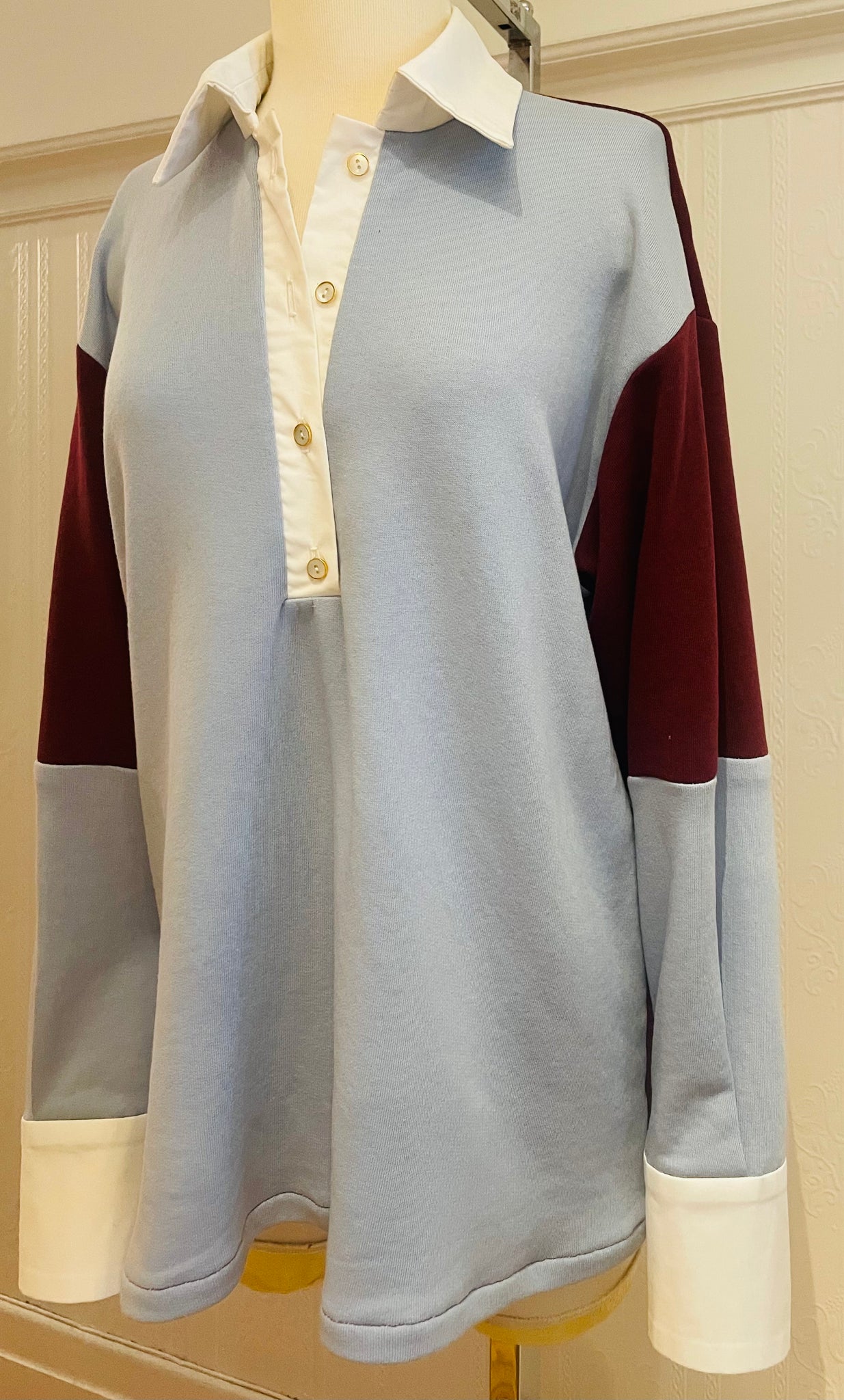 Découvrez notre Pull Universitaire, une pièce incontournable au style intemporel. Confectionné en tricot fleece de tencel, ce pull oversize allie confort et élégance avec sa combinaison de couleurs bleu clair et bordeaux. Les détails raffinés—col, patte d'ouverture et poignets en coton popeline blanc, agrémentés de petits boutons nacrés blanc et or—ajoutent une touche de sophistication. Taillé très grand pour une silhouette décontractée et moderne, ce pull universitaire devient un basique polyvalent à intégrer dans votre garde-robe.