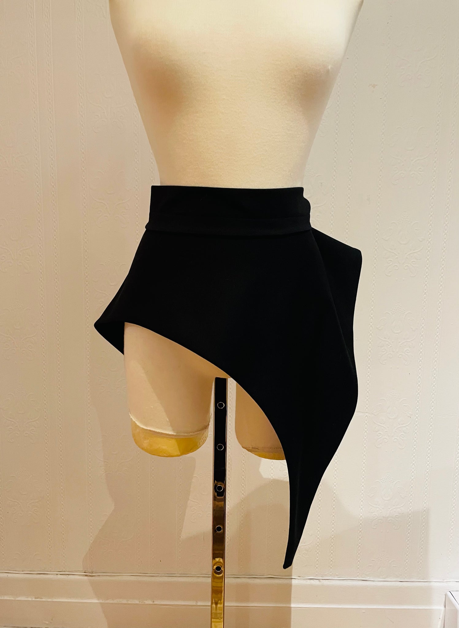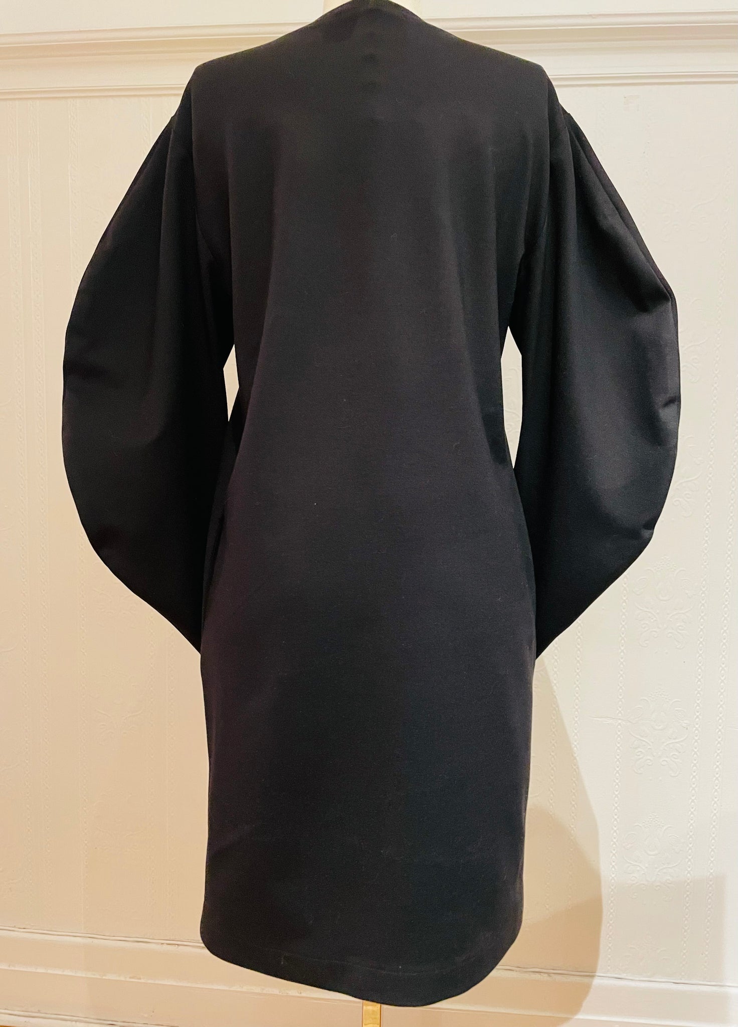 Short sweater dress with ruffle belt. Dress with almond-shaped sleeves, the sleeve cutout is recovered to make the belt. Double jersey fabric with a ribbed knit crew neck. Straight cut dress and mid-thigh hem.