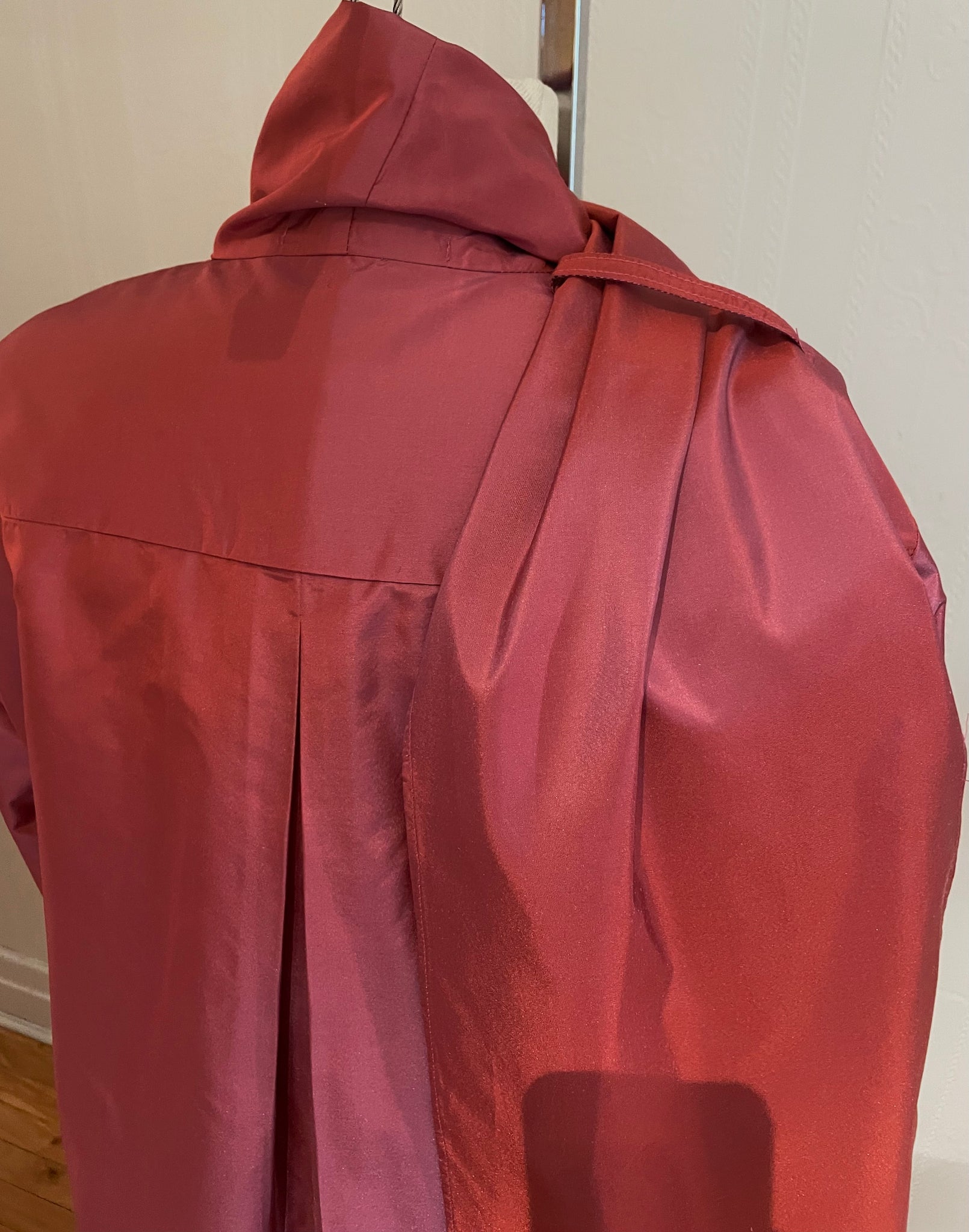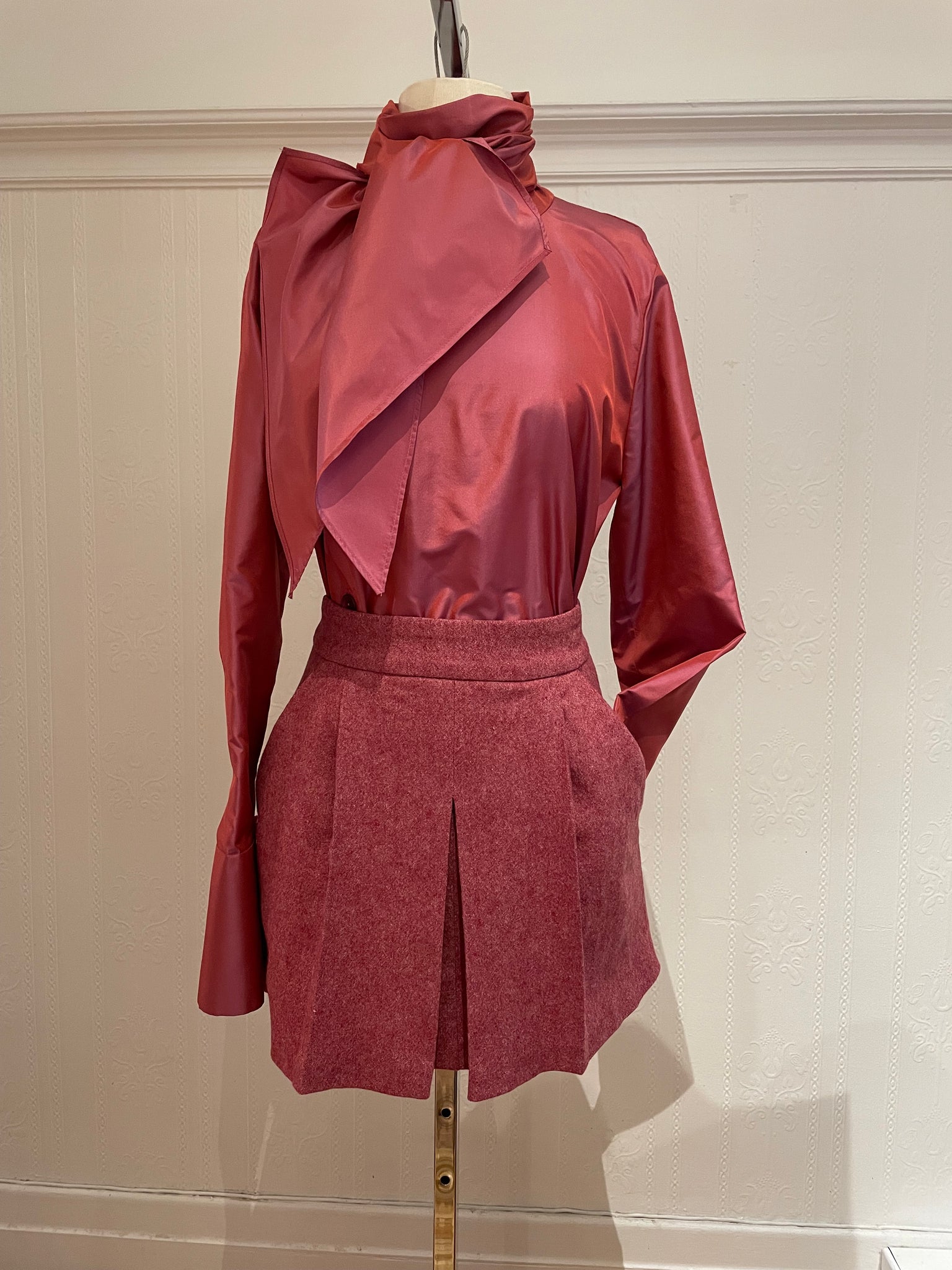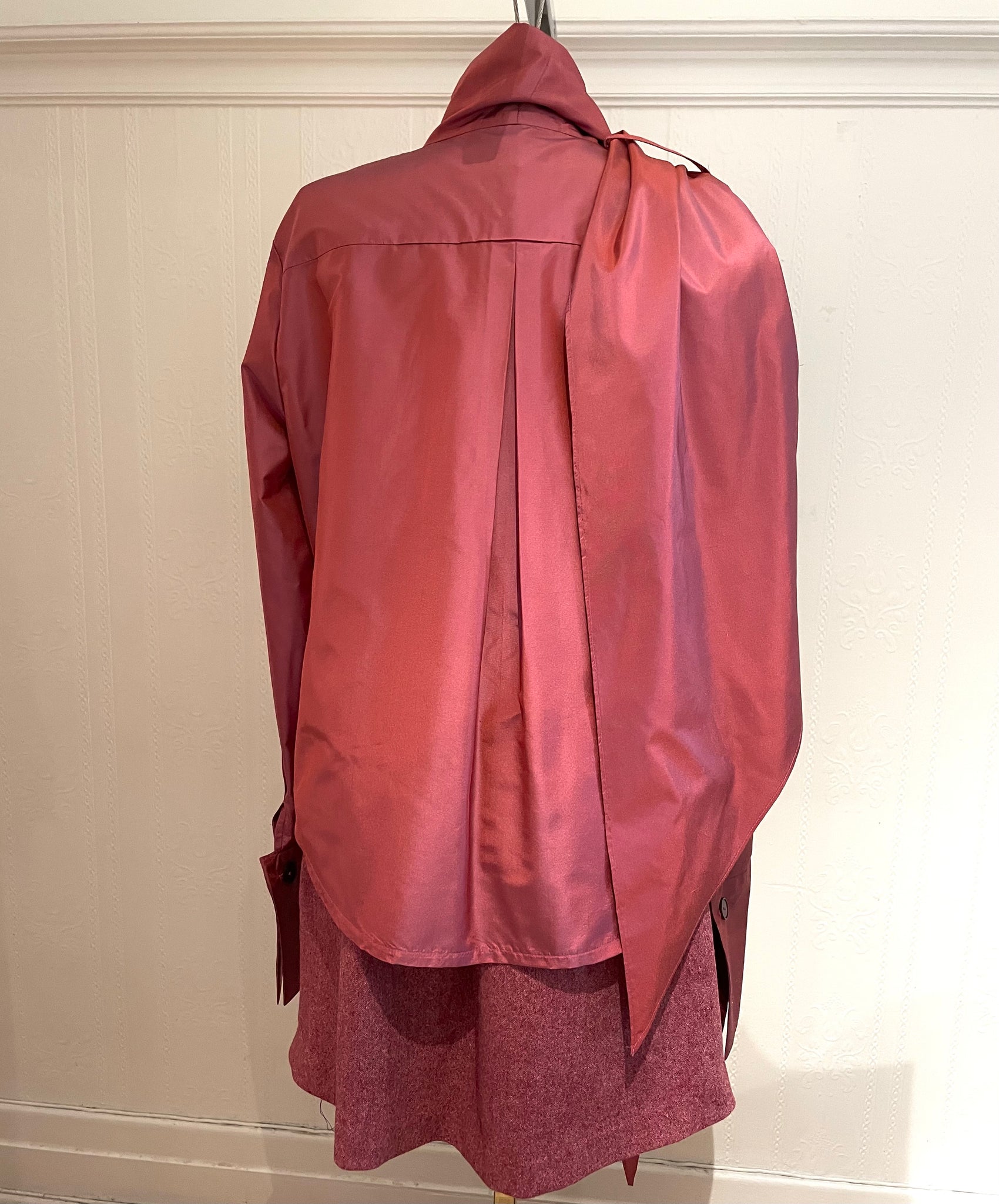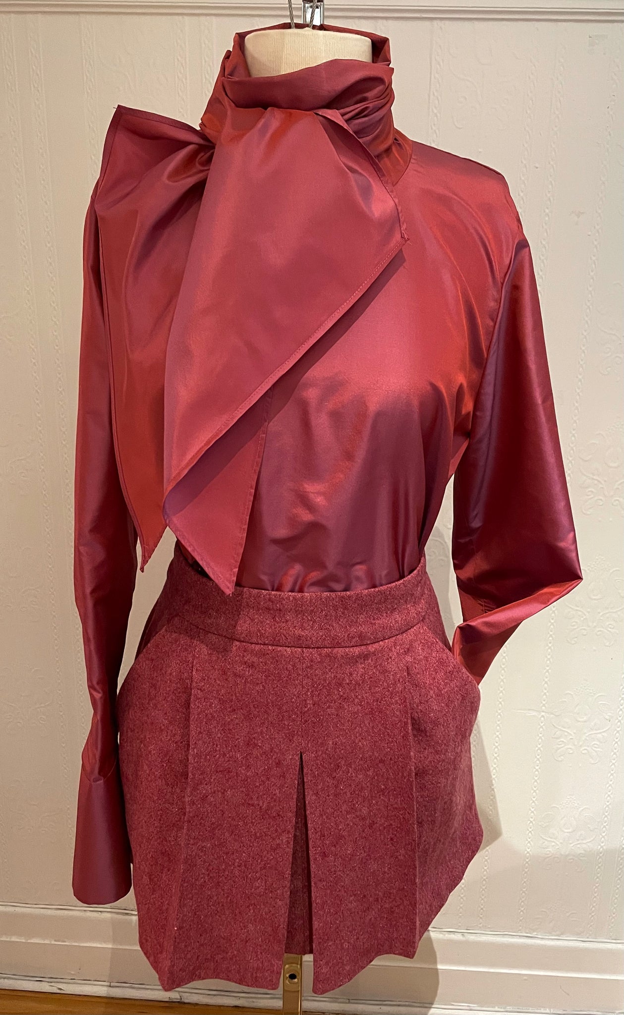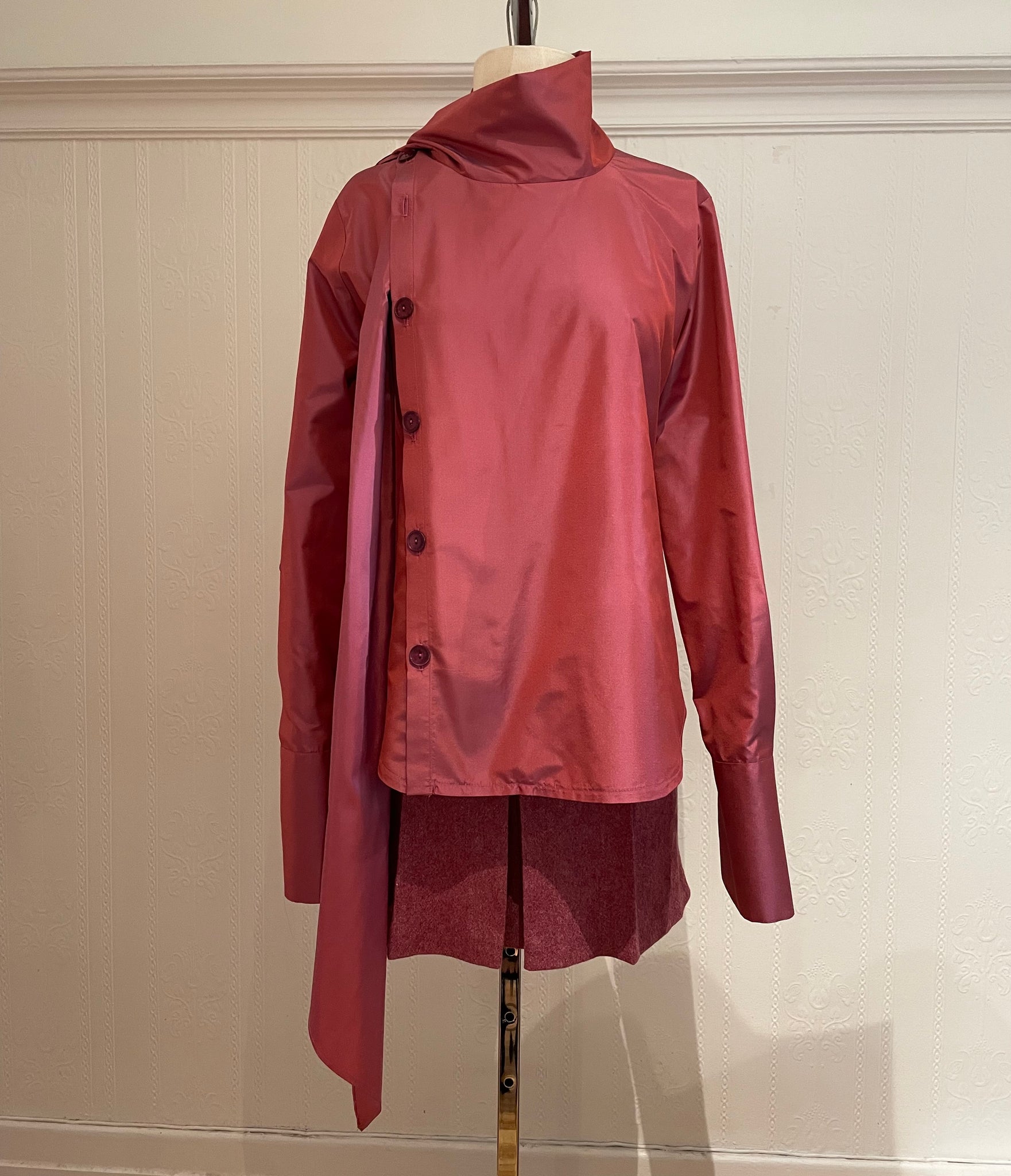 Chemise foulard confectionnée à la main en taffetas 100% soie aux reflets chatoyants et riches. Boutonnage asymétrique orné de boutons de nacre dans une teinte framboise foncé profonde. Poignets tuxedo élégants avec boutons de manchettes assortis. Le dos présente des plis creux subtils et un ourlet arrondi pour une silhouette raffinée. Une pièce intemporelle qui allie détails couture sophistiqués et matière noble pour une allure distincte.