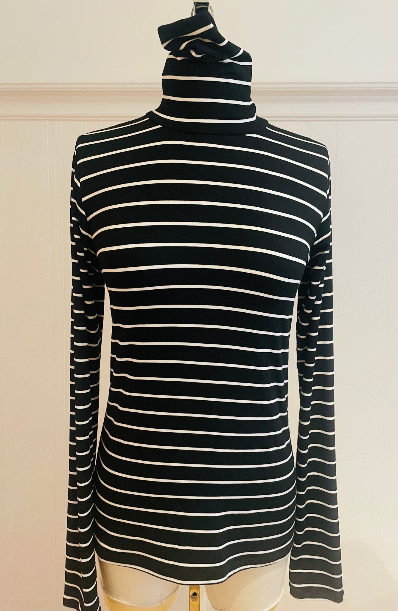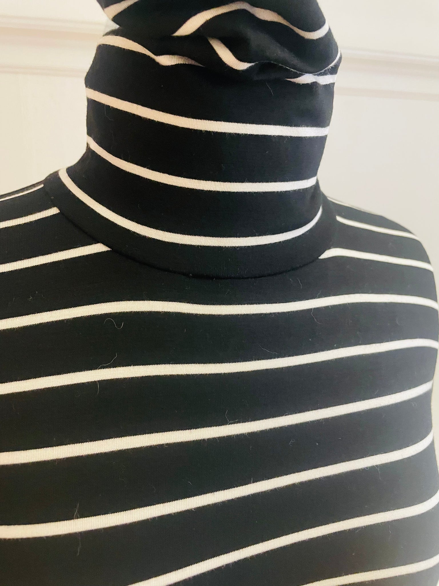 Élégant pull à rayures intemporelles en noir et blanc, confectionné dans un fin jersey de tencel et spandex pour un confort optimal. Son col montant doublé et repliable offre une polyvalence de style, passant facilement du casual au raffiné. La composition noble de la matière assure une douceur incomparable et une tenue impeccable, tandis que l'élasticité naturelle du spandex garantit une liberté de mouvement sans compromis. Une pièce incontournable pour une garde-robe sophistiquée et intemporelle.