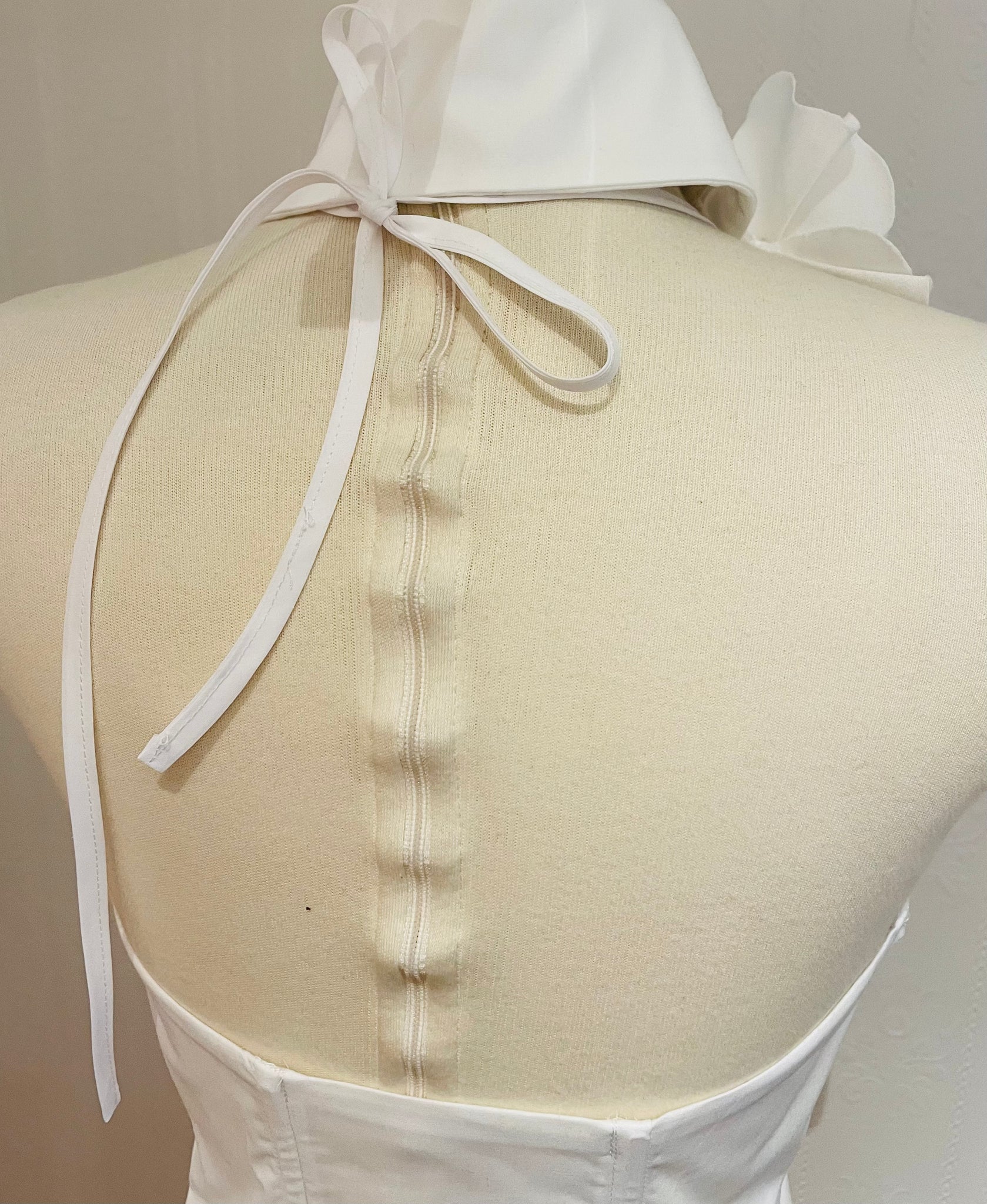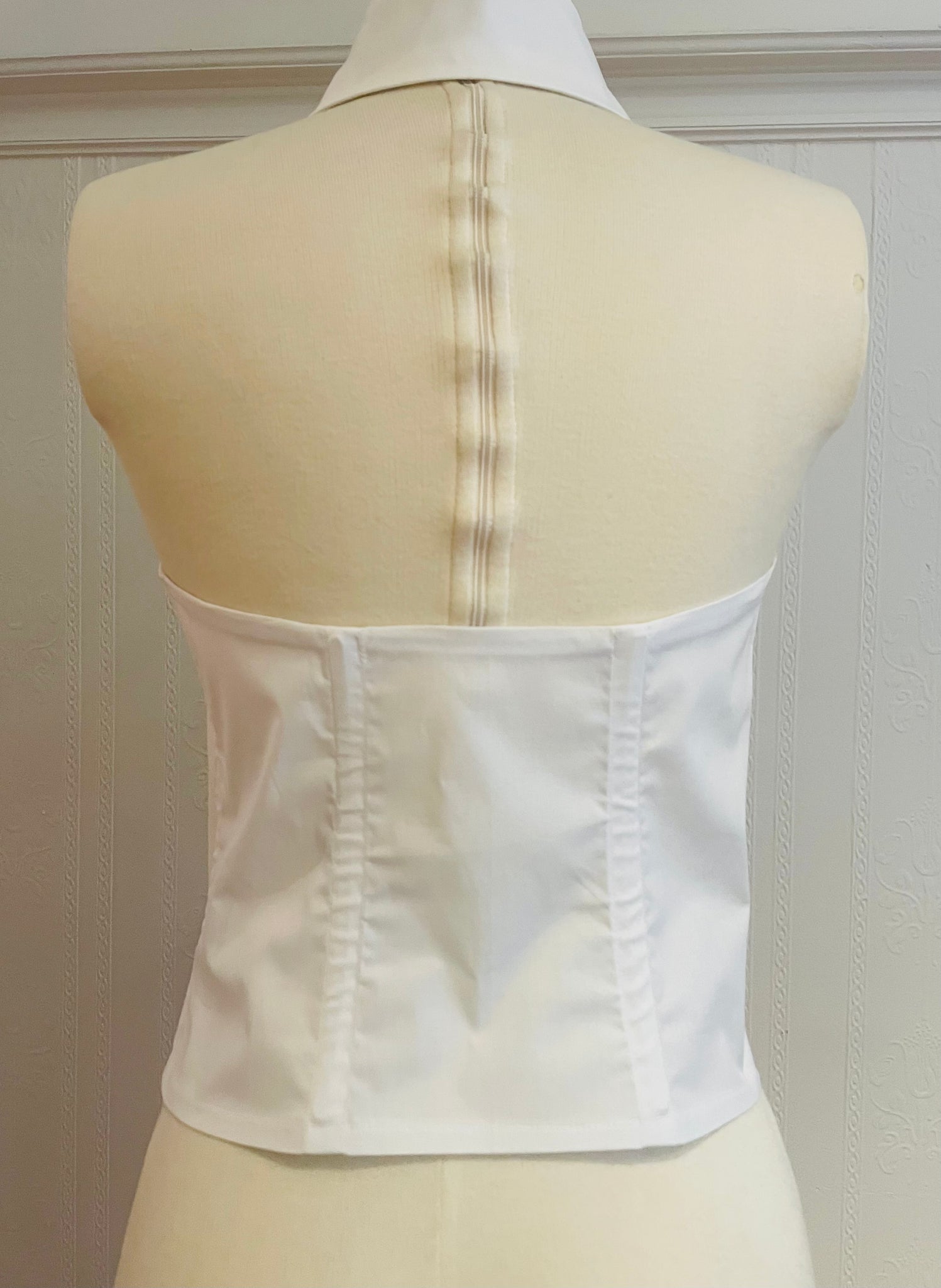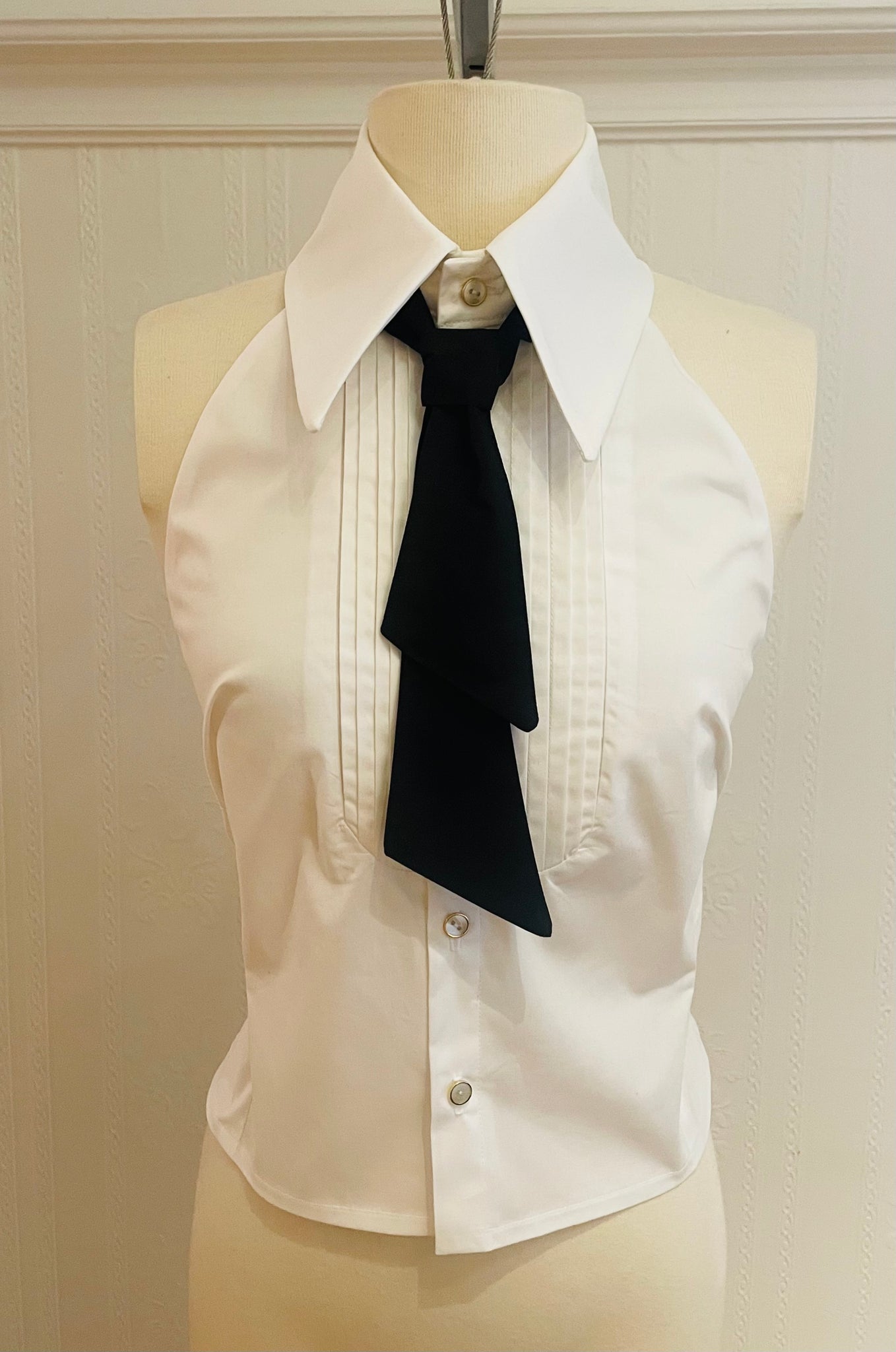Top with large and high collar, bare shoulders. Seam lines at the front with a rounded cutout. Covered back at the center of the back. White cotton and rayon fabric with spandex for comfort. Small matte black buttons with diamond point outline. Comes with the black taffeta tie.