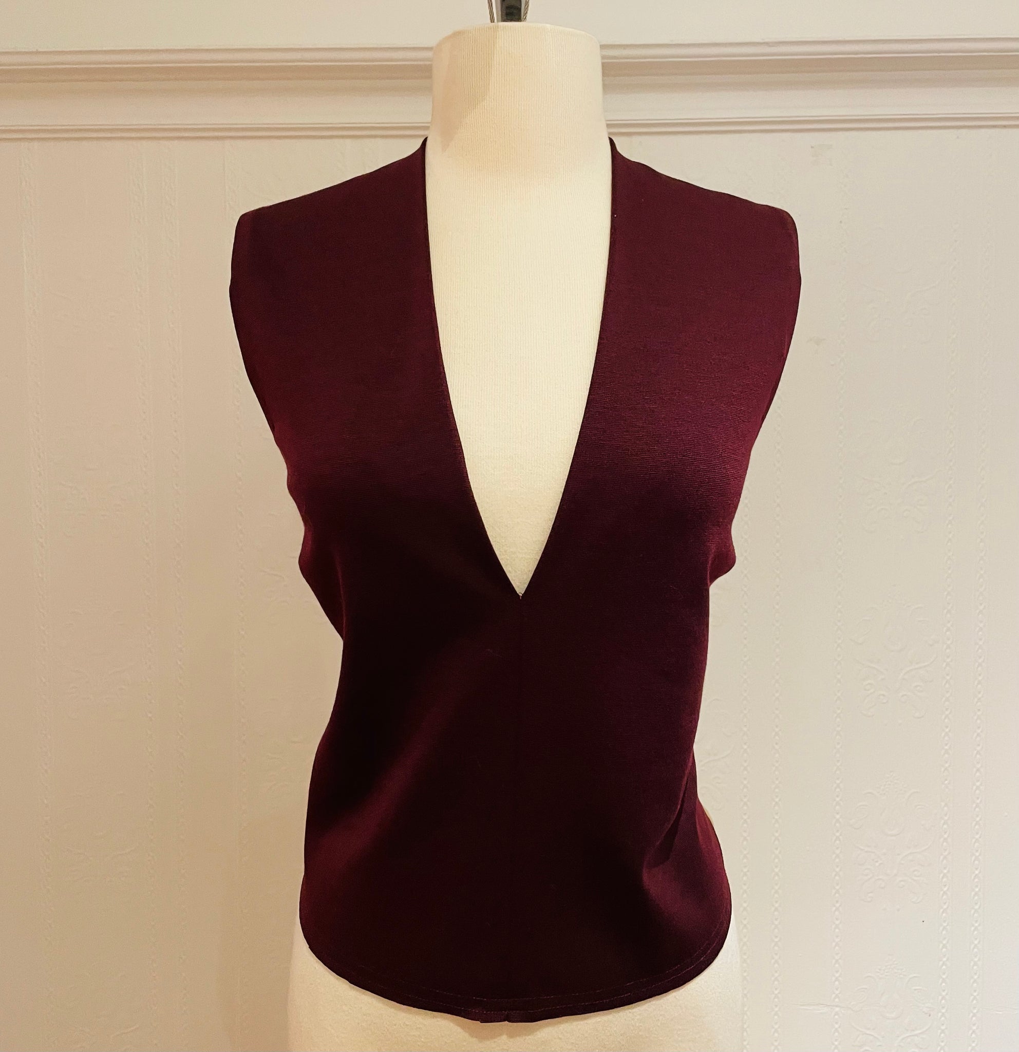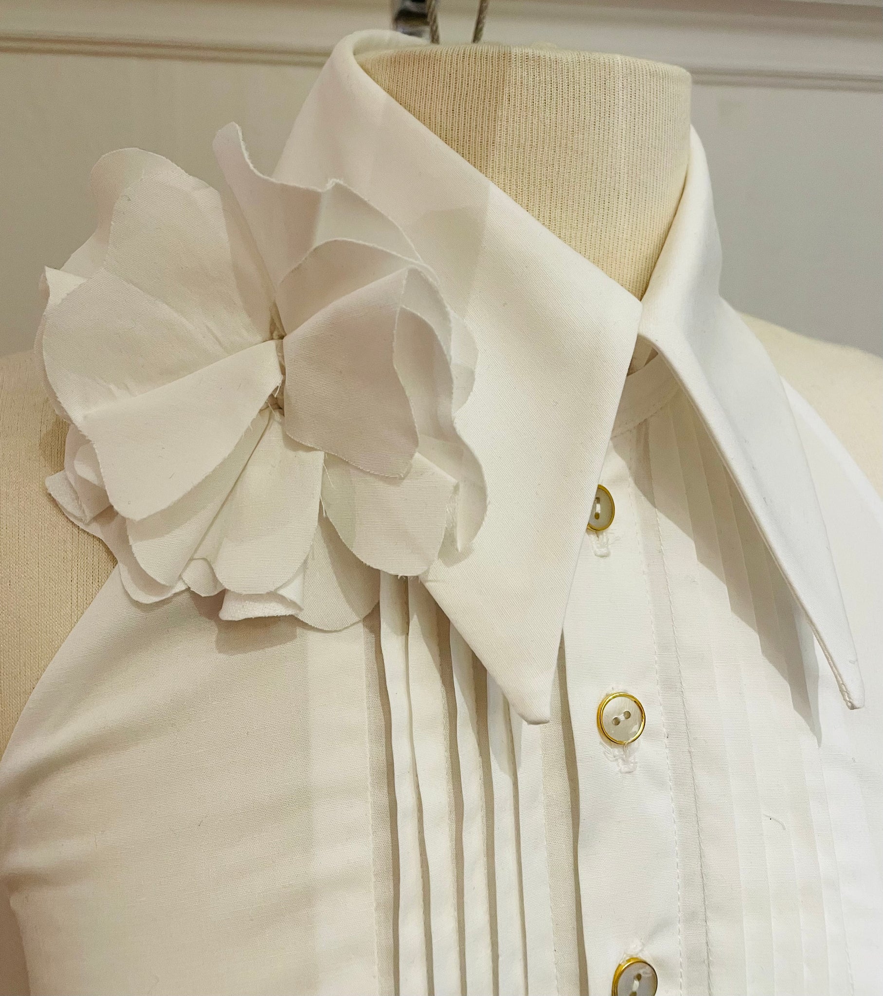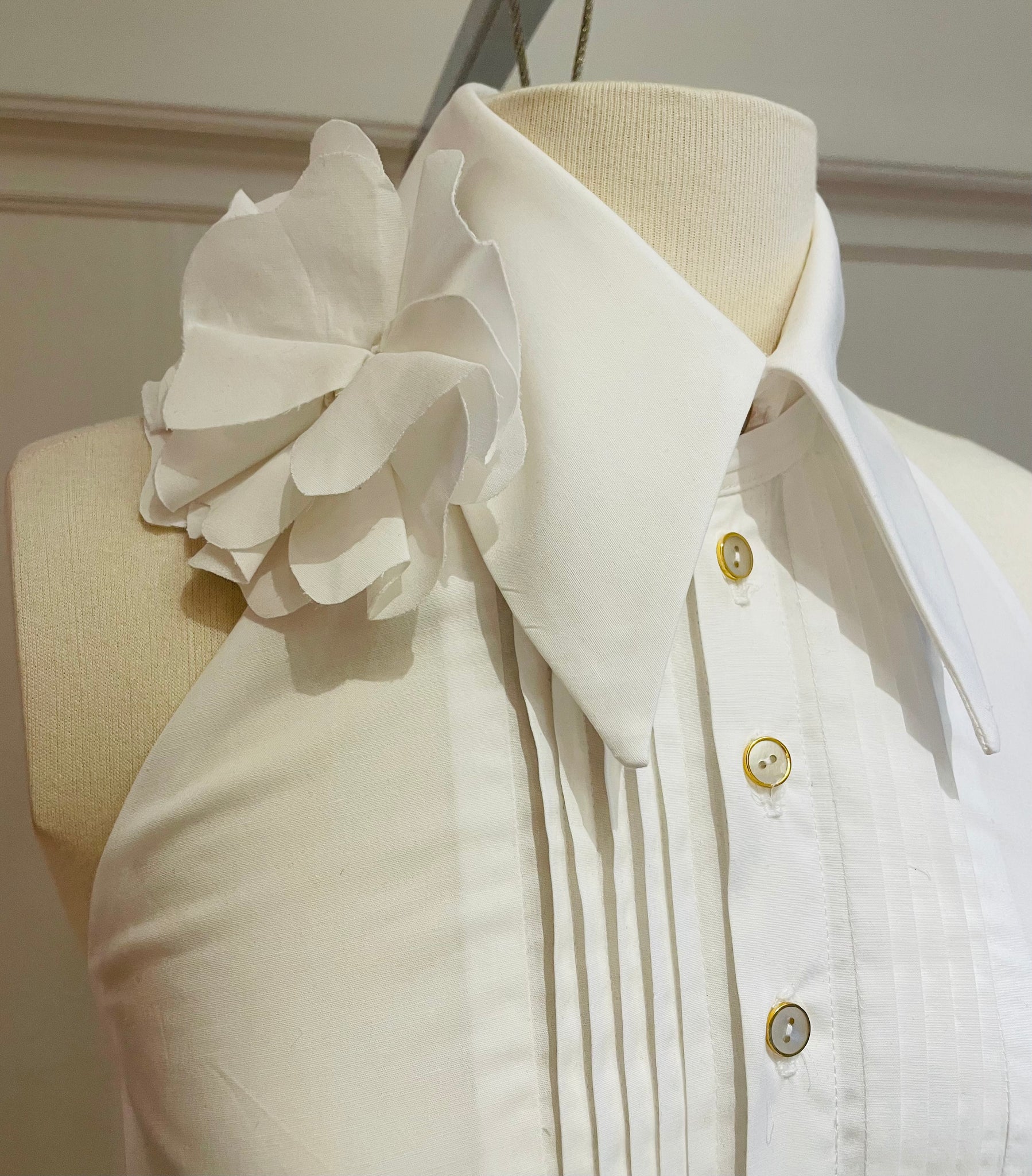 Top with large and high collar, bare shoulders. Seam lines at the front with a rounded cutout. Covered back at the center of the back. White cotton and rayon fabric with spandex for comfort. Small matte black buttons with diamond point outline. Comes with the black taffeta tie.
